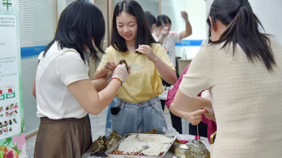 一捧艾葉草,黏甜糯米香。參賽的小伙伴們,圍成一圈,攏葉、加米、綁繩、系結(jié),或是有條不紊,或是手忙腳亂,比賽場(chǎng)上歡聲笑語(yǔ)不絕。